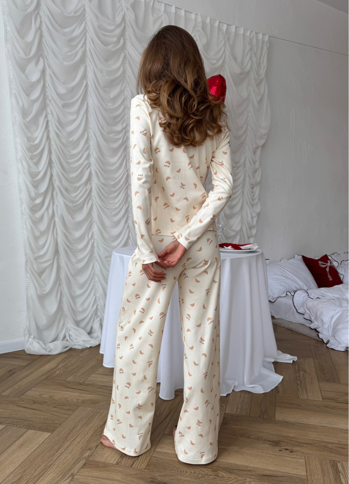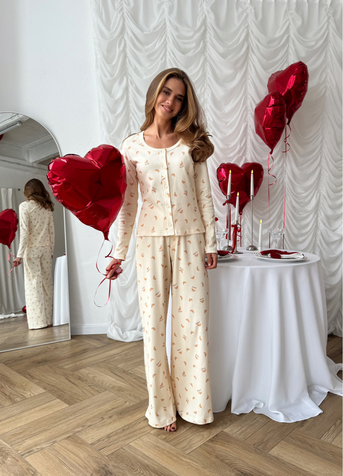 Піжама «Аманді» — це гламурний домашній образ, у якому ніжний силует і делікатний принт із круасанами створюють атмосферу легкості, затишку та естетики. Модель поєднує комфорт і жіночність, роблячи домашній гардероб особливо стильним.