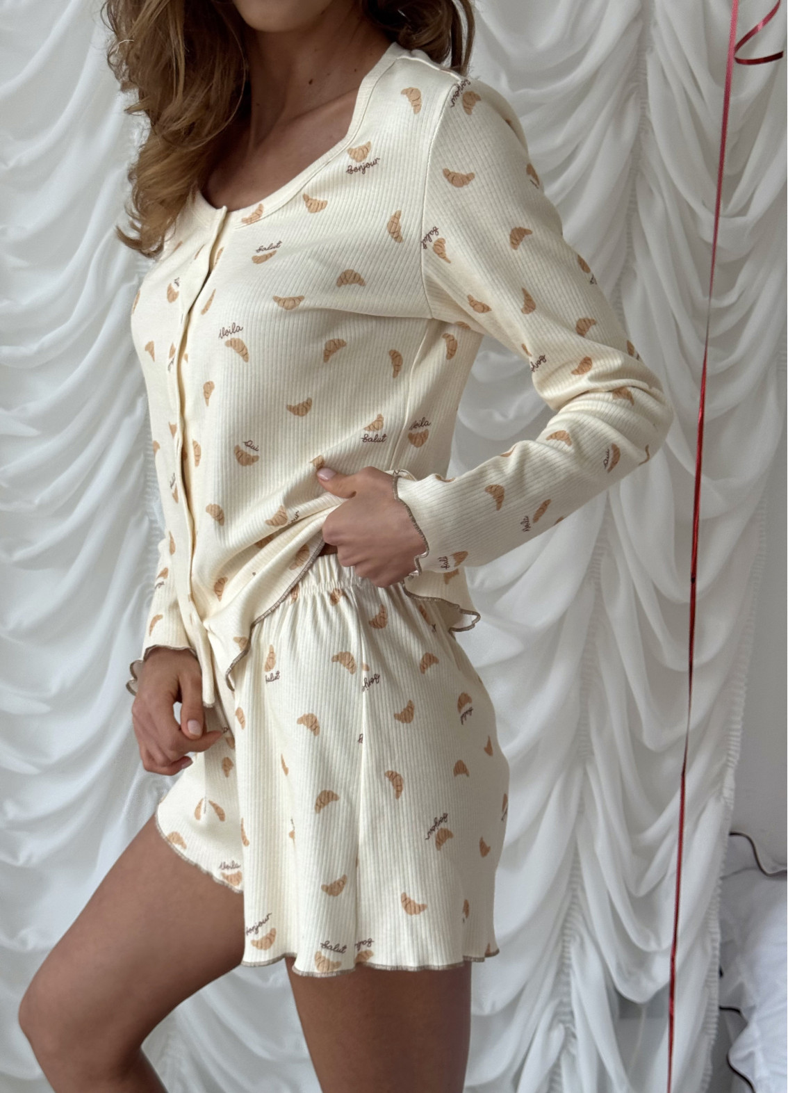 Піжама «Аманді» — це гламурний домашній образ, у якому ніжний силует, декоративні ґудзики та делікатний принт із круасанами створюють атмосферу легкості, затишку та естетики. Модель поєднує комфорт і жіночність, роблячи домашній гардероб особливо стильним.