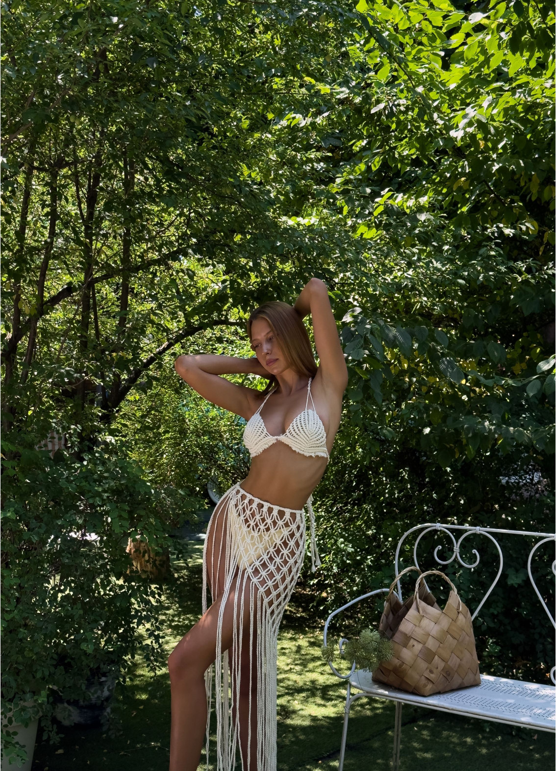 Комплект "Арлін" — це яскраве поєднання витонченого рукоділля та сучасної пляжної моди. Виготовлений вручну з натурального матеріалу, цей образ поєднує сміливість, легкість і комфорт. Комплект складається з в’язаного бюстгальтера та довгої сітчастої спідниці з високим розрізом, що створює ефектний і спокусливий силует.