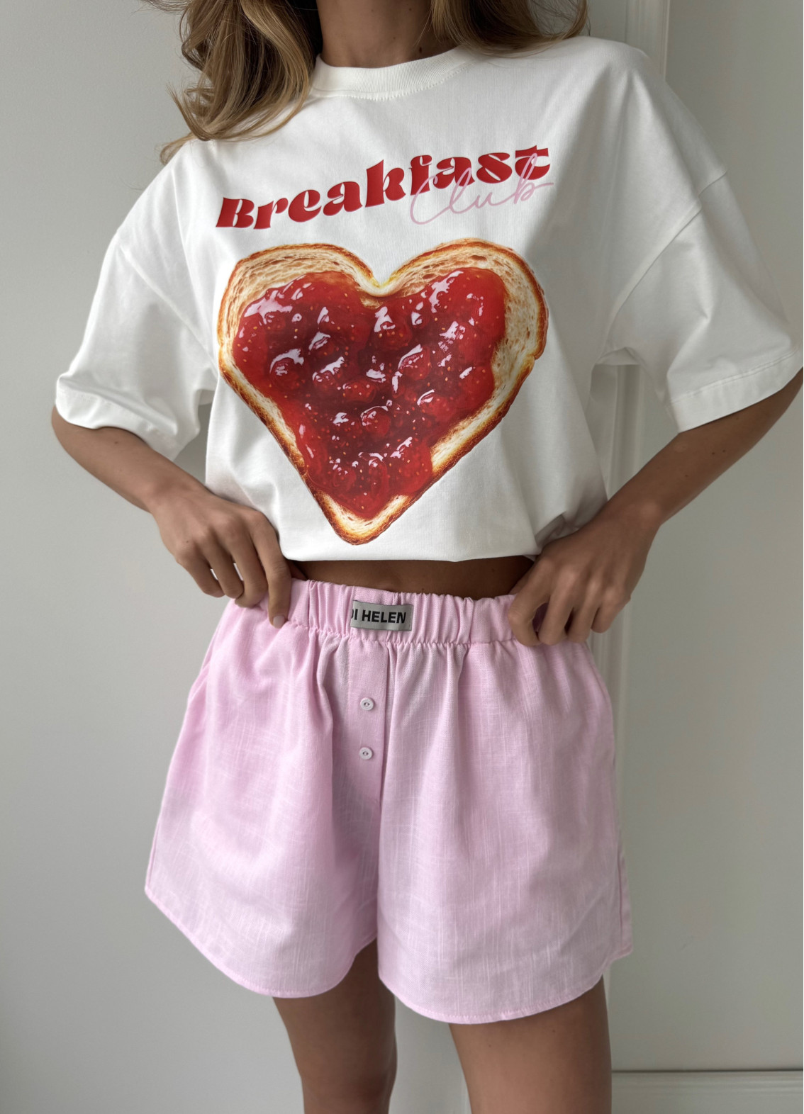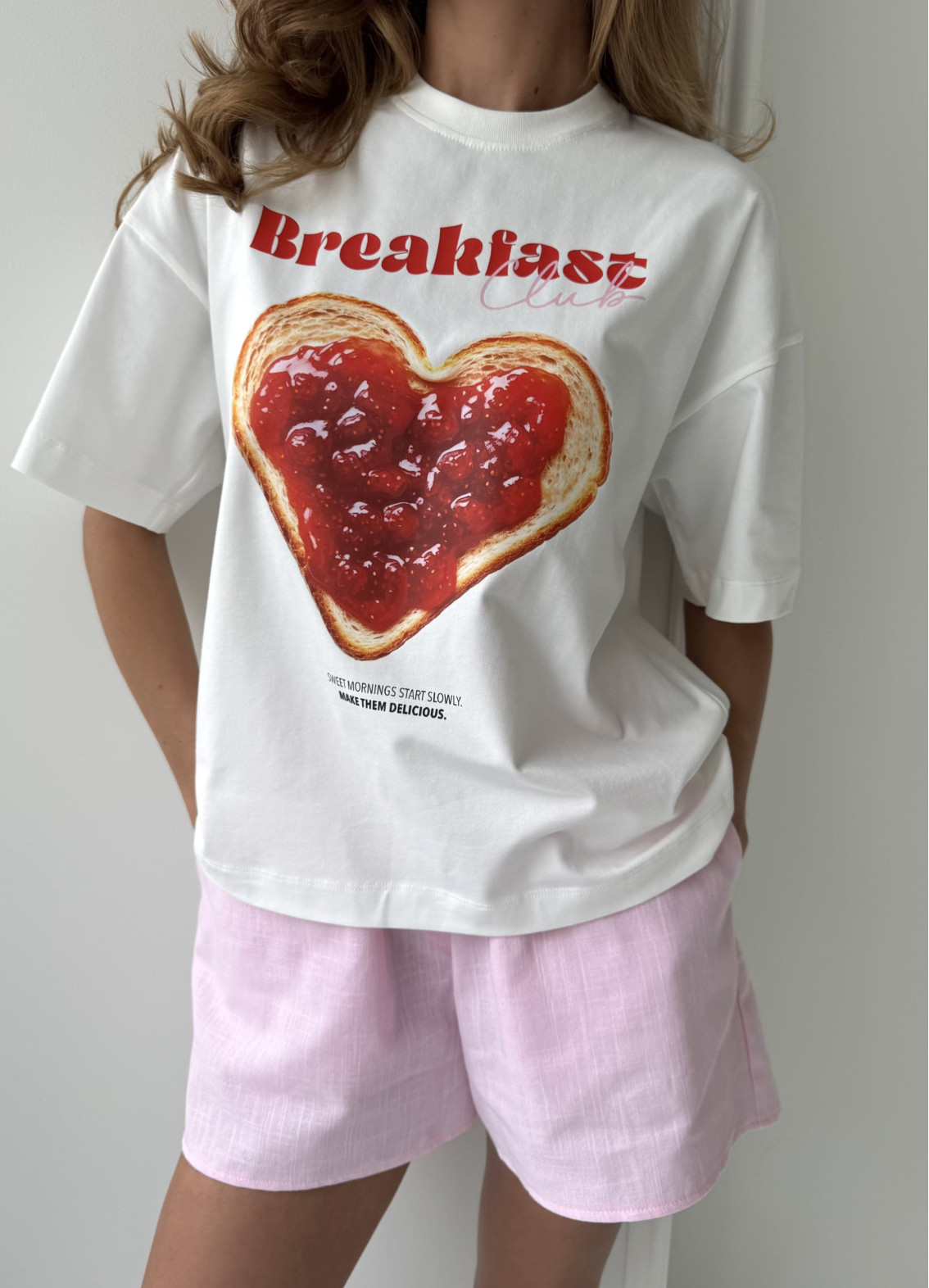 Піжама "Breakfast club" — комфортний та стильний комплект для затишного домашнього відпочинку. М’яка та приємна до тіла тканина забезпечує легкість рухів і зручність упродовж усього дня. Модель поєднує універсальну футболку з кольоровим принтом та шорти, створюючи практичний та сучасний домашній образ.