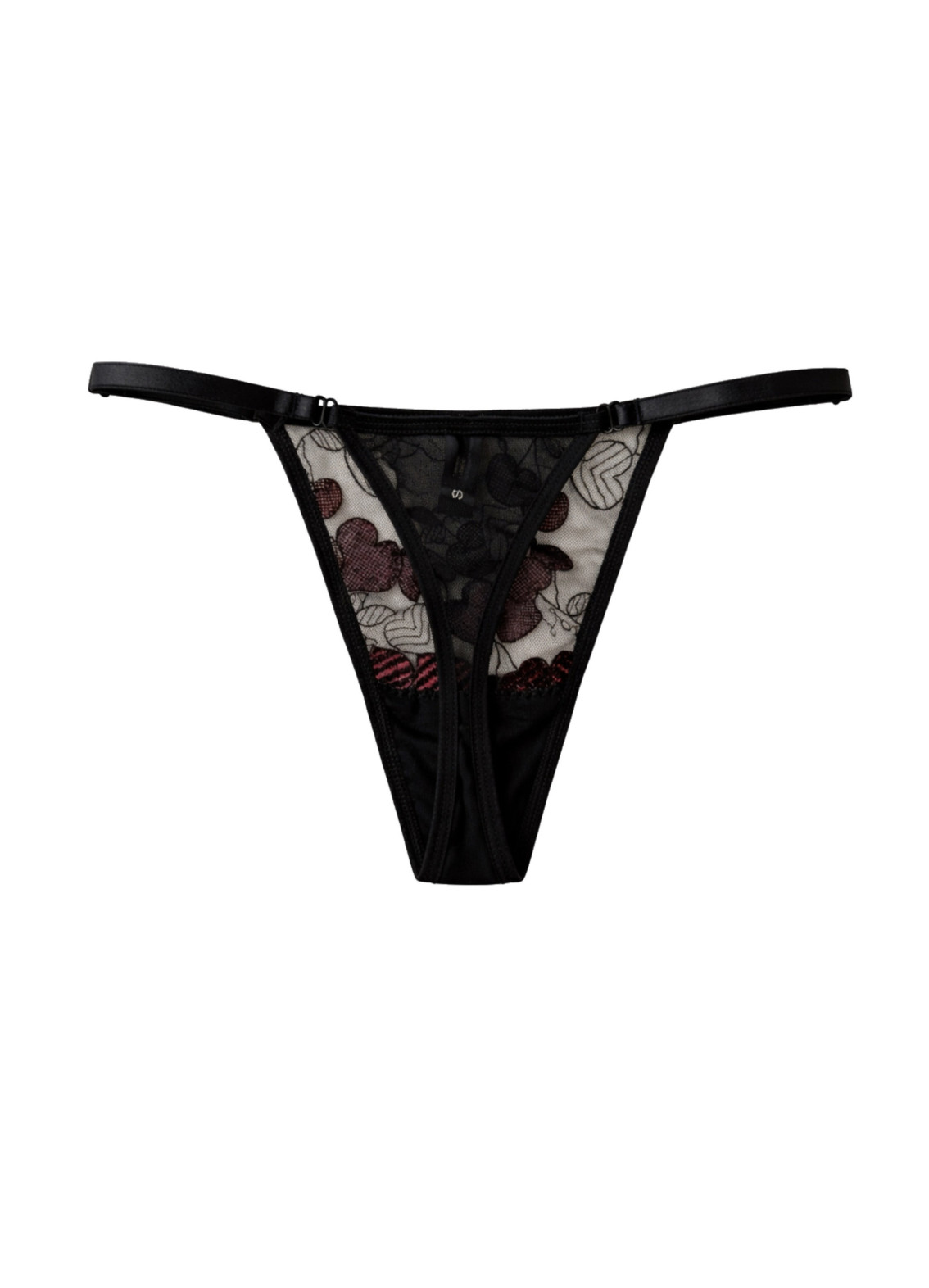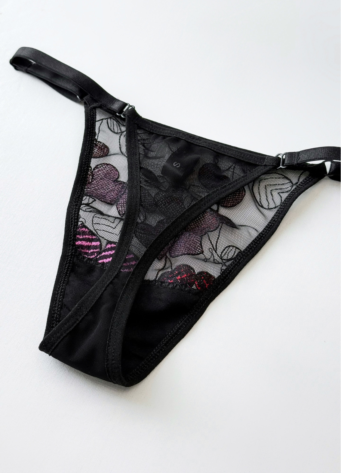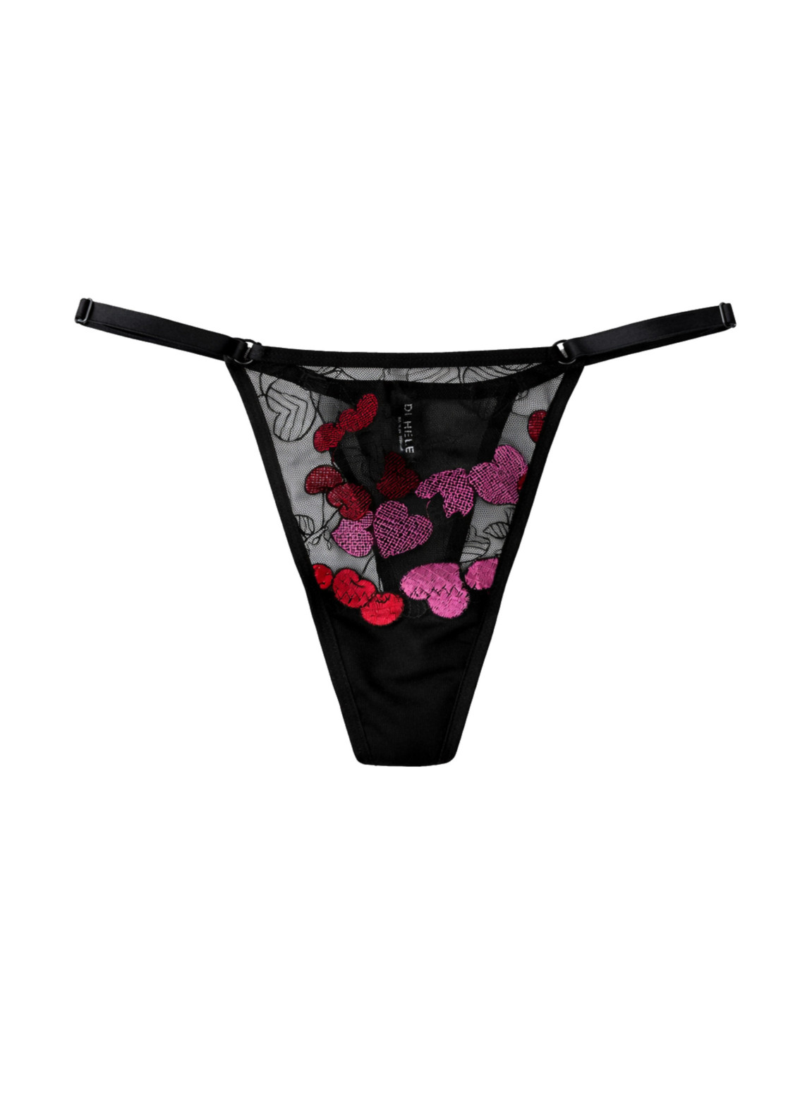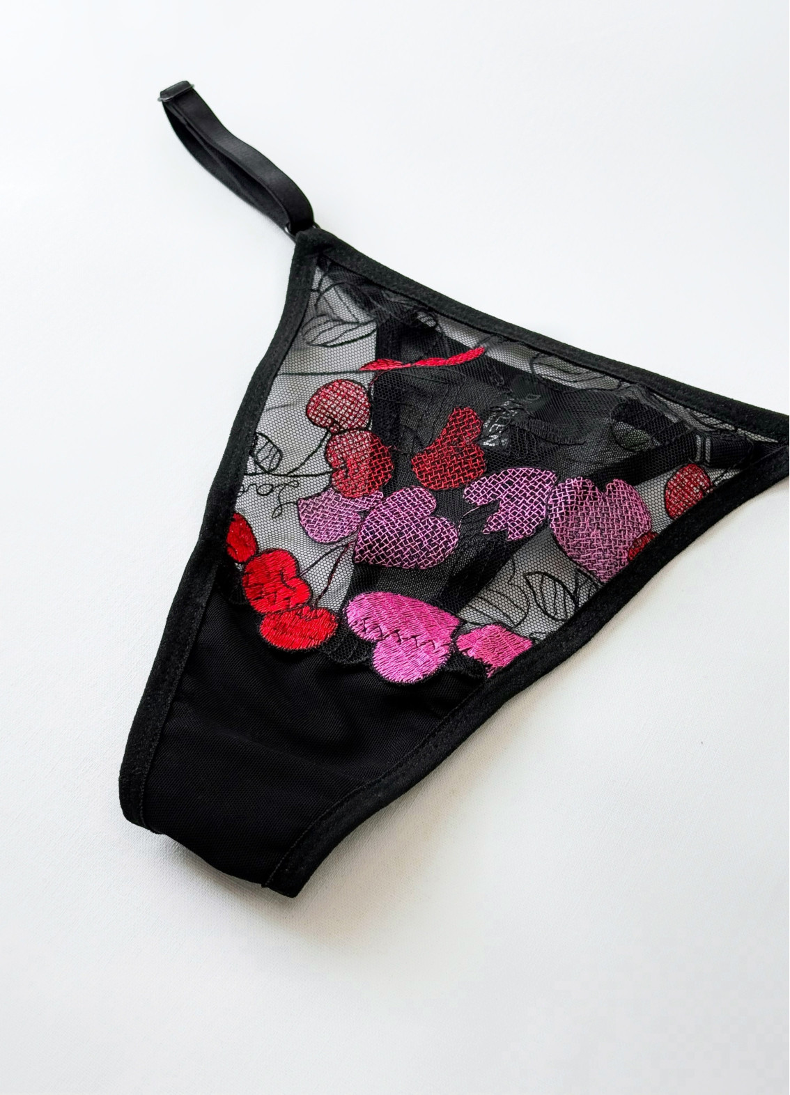 Трусики-стрінги «Чері» — це витончена комбінація елегантності та жіночності. Чорне мереживо на ніжній сіточці прикрашене вишивкою у вигляді сердечок та вишеньок рожевого та червоного кольору, створюючи унікальний та стильний образ. Модель оснащена регуляторами для ідеальної посадки.
