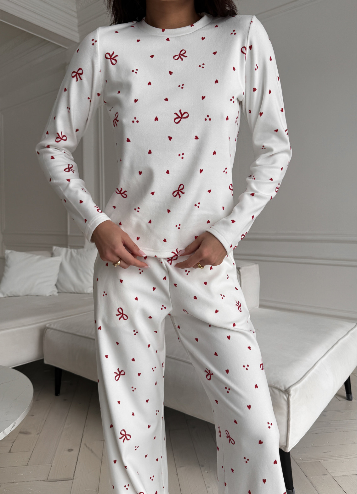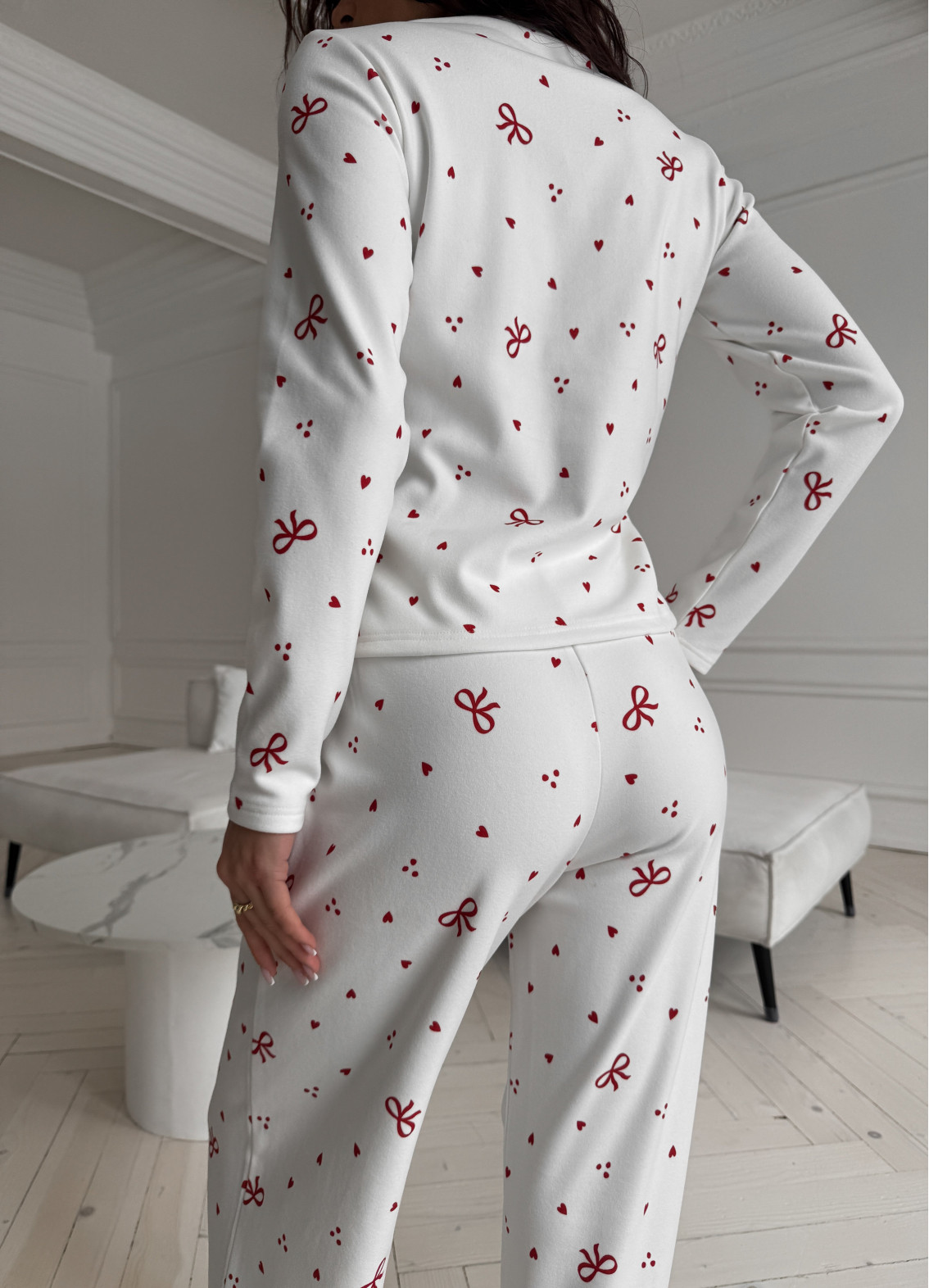 Піжама "Джеймі" — це ніжний та романтичний домашній комплект, який поєднує комфорт і стильний дизайн. Світлий базовий відтінок із милим принтом у вигляді сердечок і бантиків створює легкий, грайливий настрій та додає образу жіночності. М’якенька тканина типу фліс ніжно огортає тіло, дарує відчуття тепла та затишку, добре тягнеться і забезпечує максимальний комфорт під час сну та домашнього відпочинку.