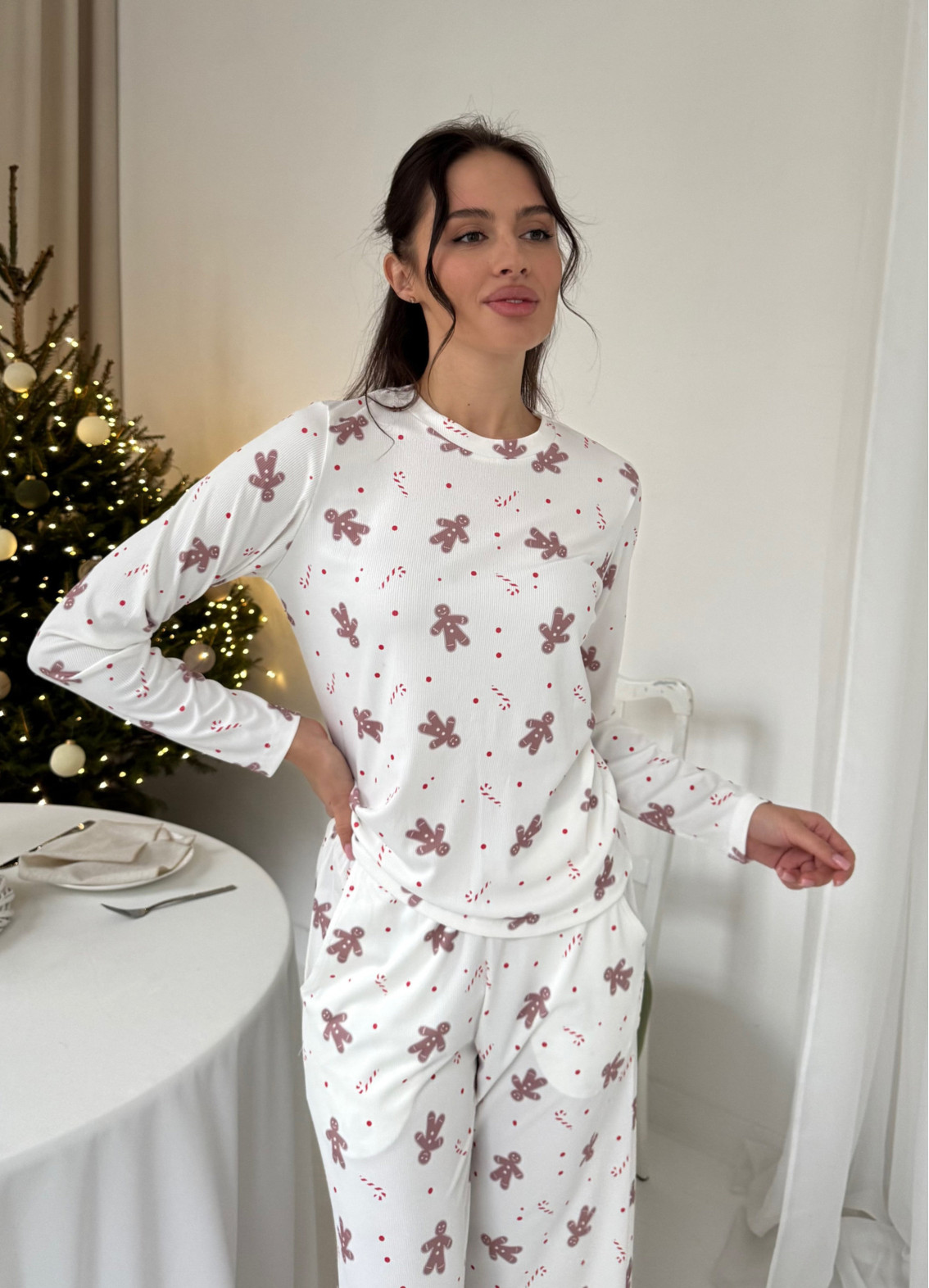 Піжама "Джинджер" — надзвичайно м’який та затишний комплект, створений для комфортного відпочинку вдома. Легка еластична тканина ніжно облягає тіло, не сковує рухів і дарує приємні тактильні відчуття. Новорічний принт у вигляді пряничок додає образу святкового настрою та особливого шарму.