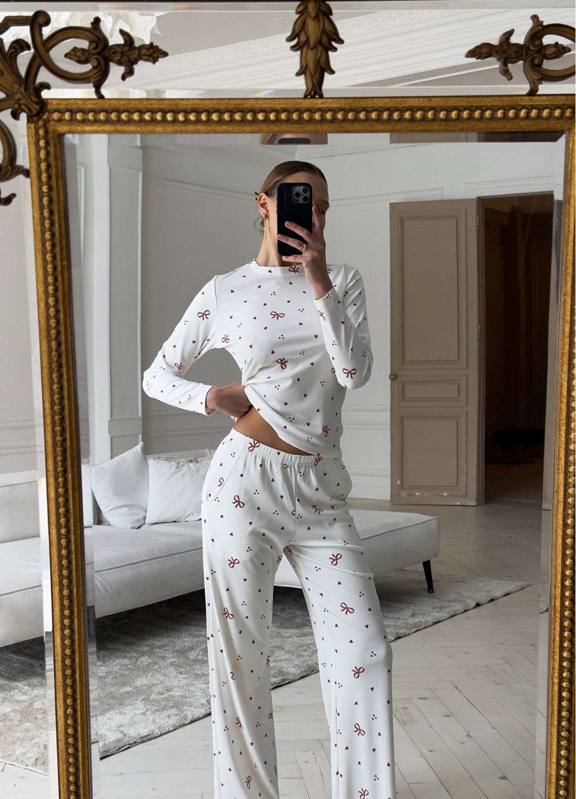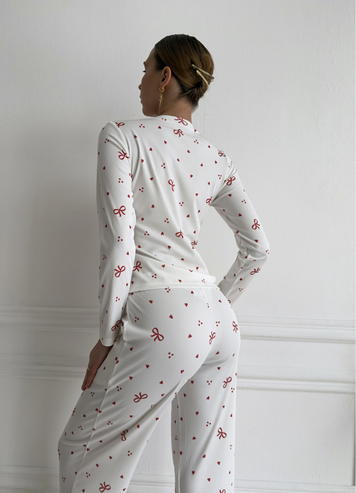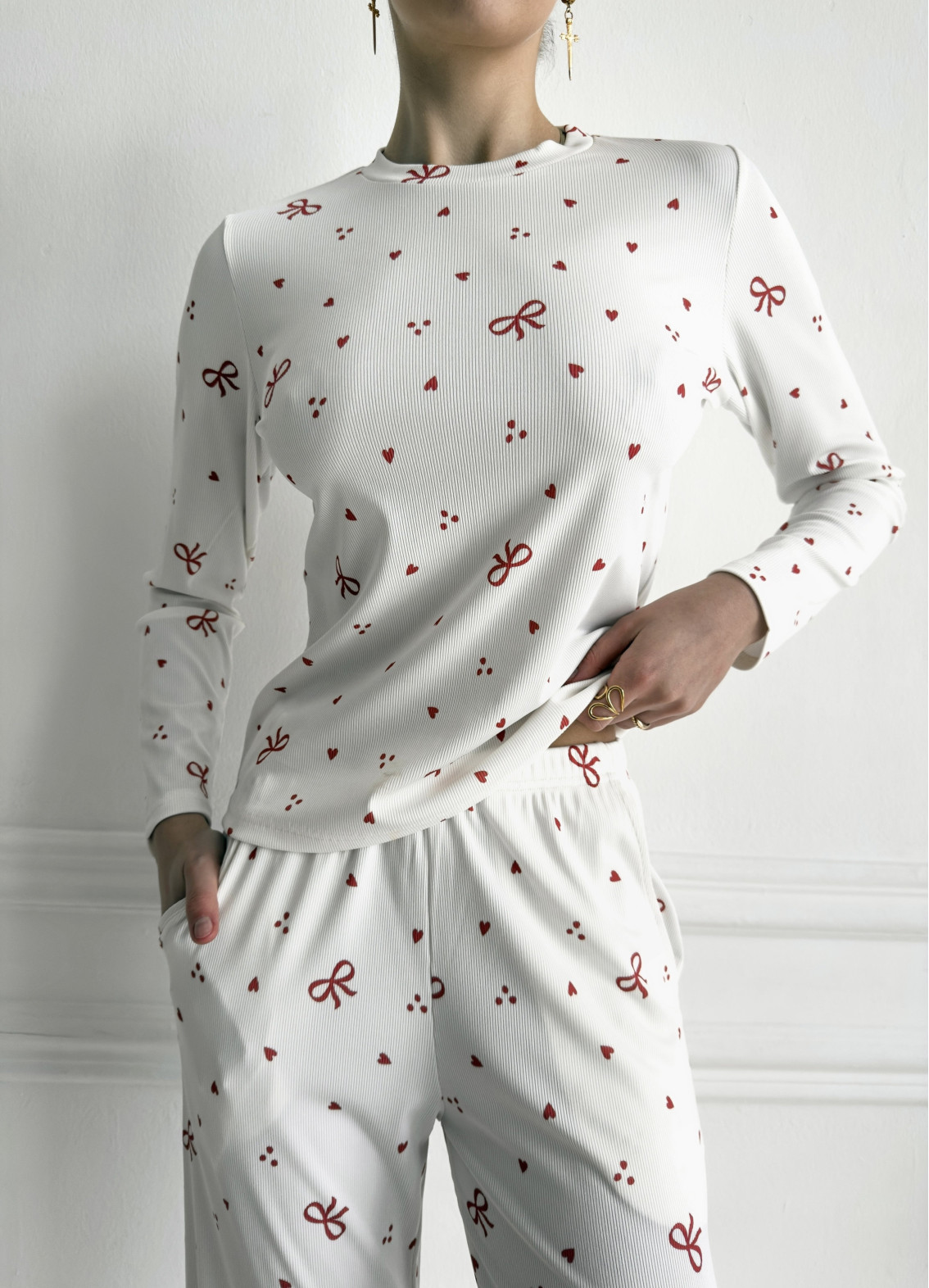 Піжама «Еделін» — це ніжний та романтичний домашній образ, що поєднує комфорт і жіночність. Чарівний принт із сердечками та бантиками створює легкий, грайливий настрій і додає образу особливої ніжності. Модель ідеально підходить для затишних вечорів, комфортного сну та стильних домашніх моментів.