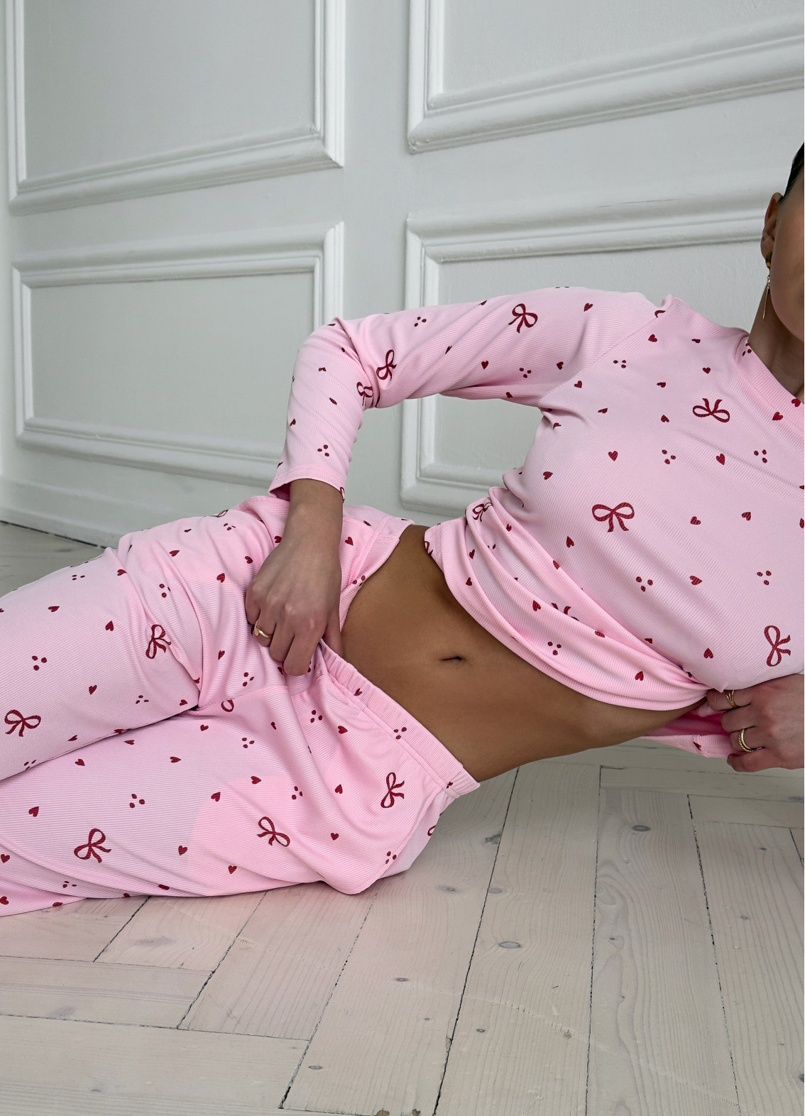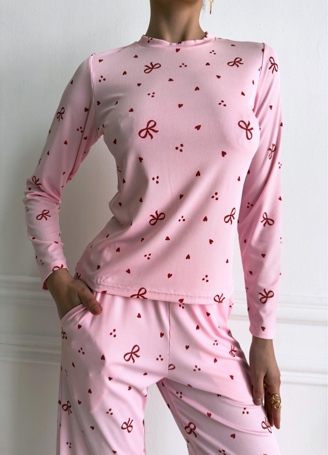 Піжама «Еделін» — це ніжний та романтичний домашній образ, що поєднує комфорт і жіночність. Чарівний принт із сердечками та бантиками створює легкий, грайливий настрій і додає образу особливої ніжності. Модель ідеально підходить для затишних вечорів, комфортного сну та стильних домашніх моментів.