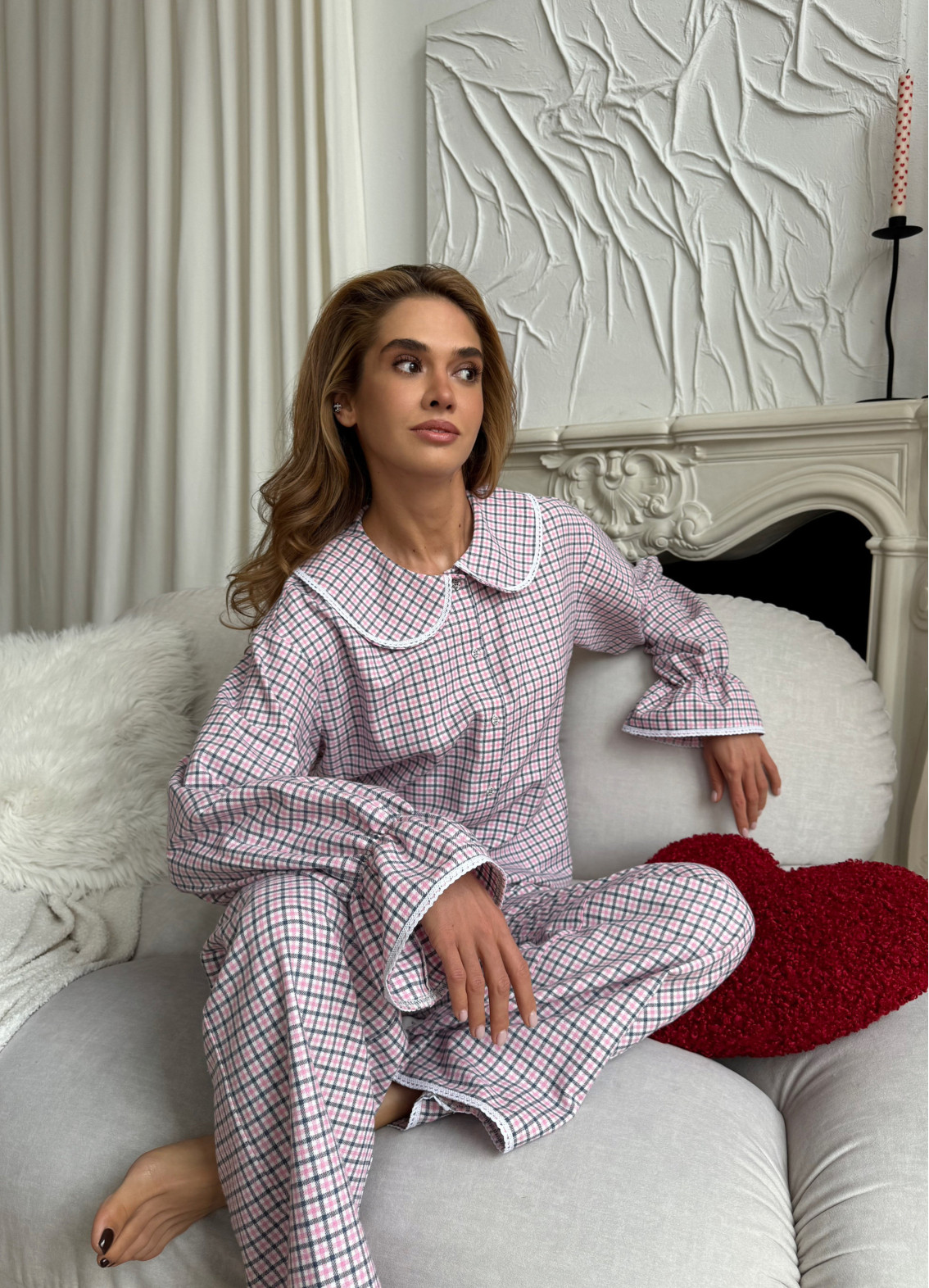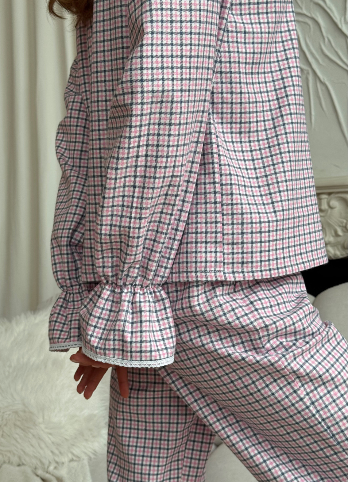 Сорочка на гудзиках із класичним комірцем виглядає елегантно та водночас невимушено. Ніжне оздоблення білим мереживом додає романтичності та витонченості, а красиві акцентні рукави створюють стильний силует і підкреслюють сучасний характер моделі. Штани вільного крою з кишенями дарують максимальний комфорт і практичність, а мереживо по низу гармонійно завершує образ.