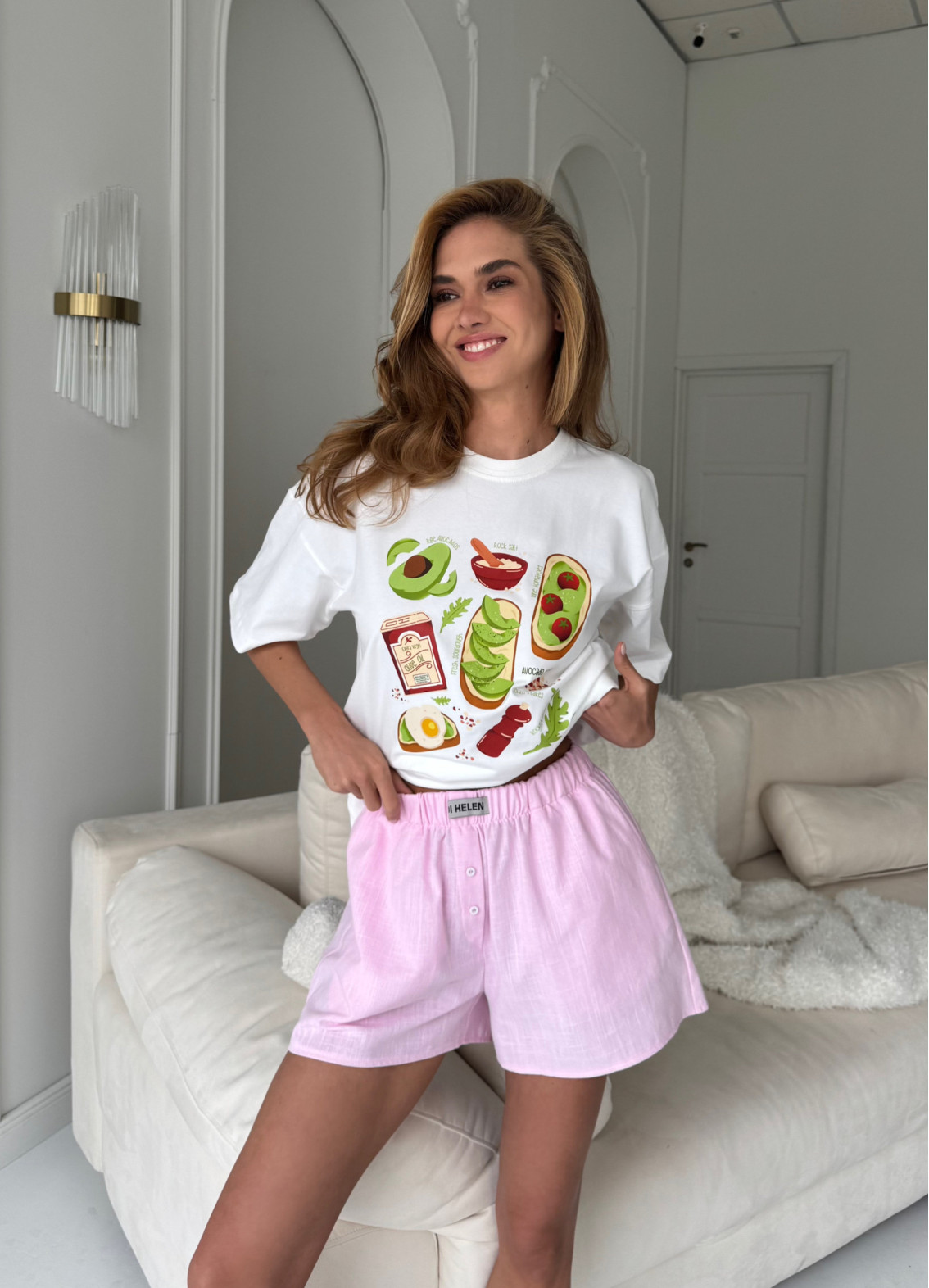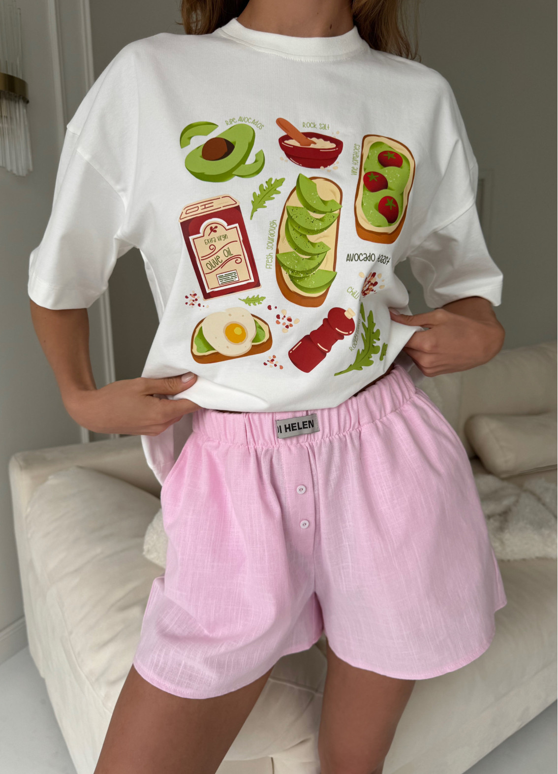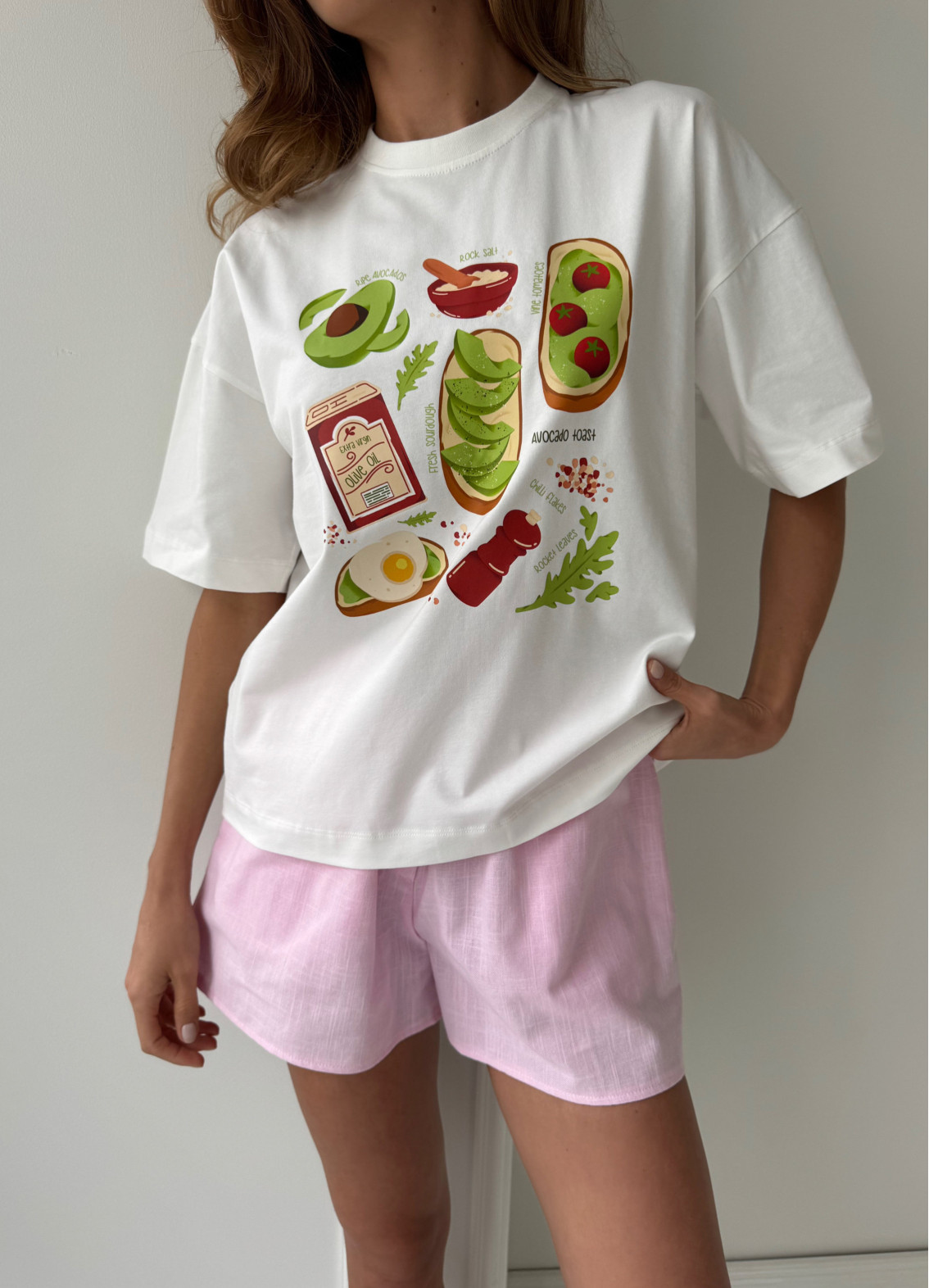 Піжама "Avokado tost" — комфортний та стильний комплект для затишного домашнього відпочинку. М’яка та приємна до тіла тканина забезпечує легкість рухів і зручність упродовж усього дня. Модель поєднує універсальну футболку з кольоровим принтом та шорти, створюючи практичний та сучасний домашній образ.