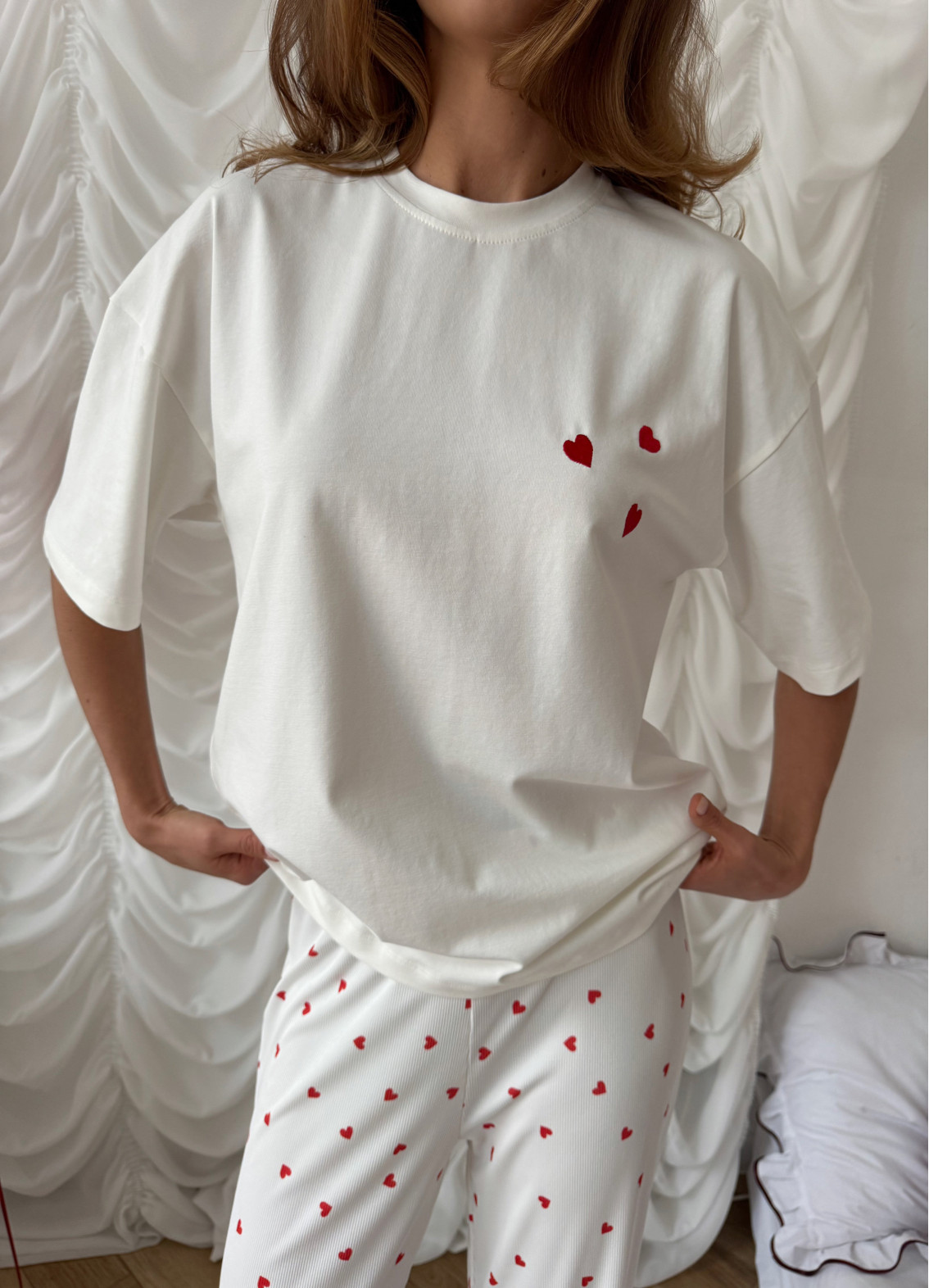 Піжама «Love» — це ніжний та затишний домашній комплект, створений для комфорту та романтичного настрою. М'яка біла футболка з милим принтом у вигляді червоних сердечок додає грайливості та легкості образу, а штани з текстурою «рубчик», прикрашені маленькими червоними сердечками по всій довжині, створюють неповторний і стильний вигляд. Цей комплект ідеально підходить для затишних вечорів вдома та спокійного сну.