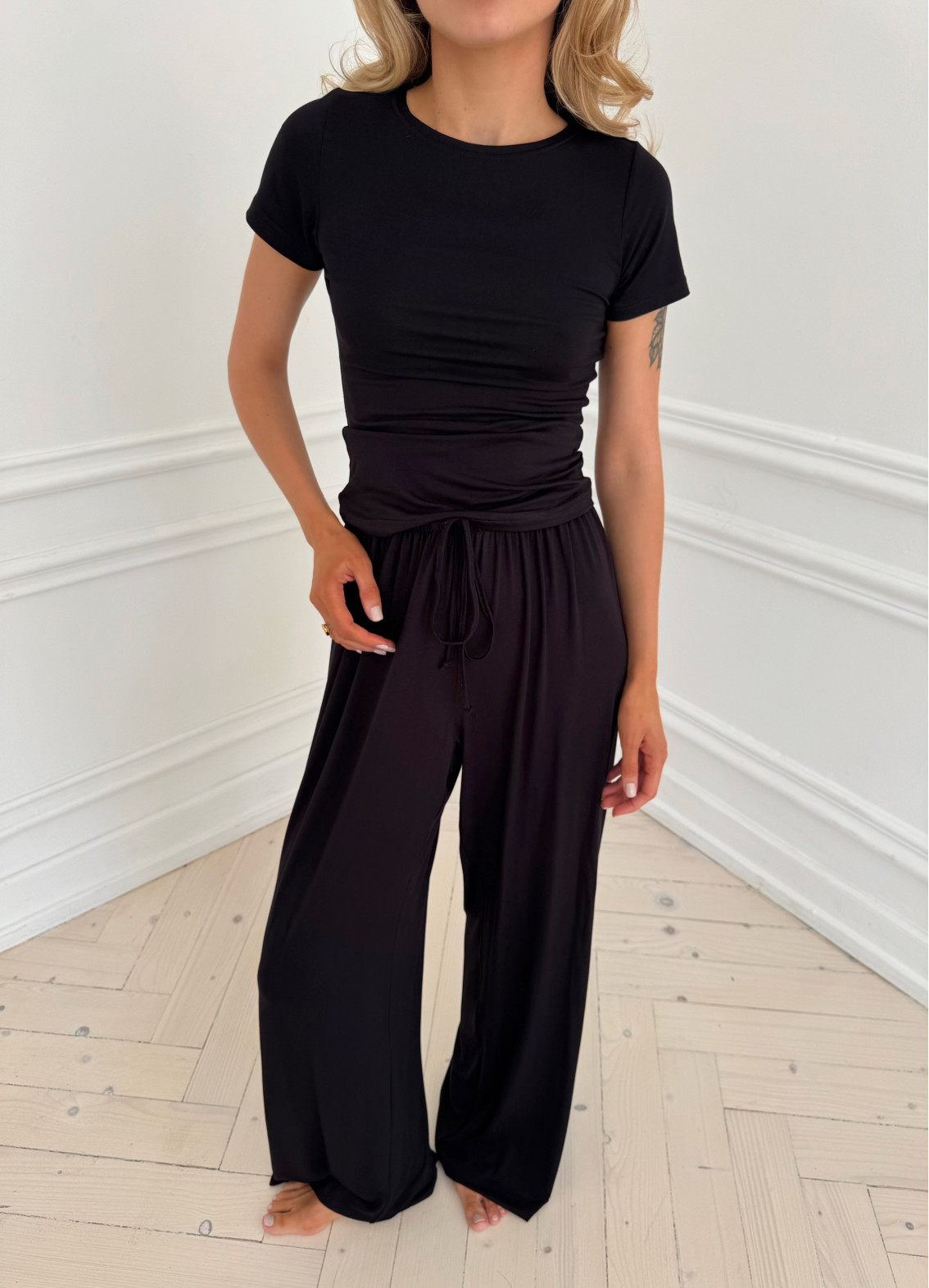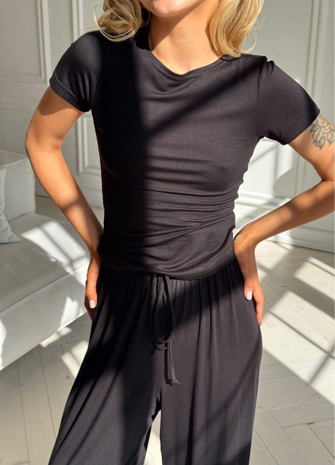 На моделі розмір XS/S (штани — XS/S, футболка — XS/S).
