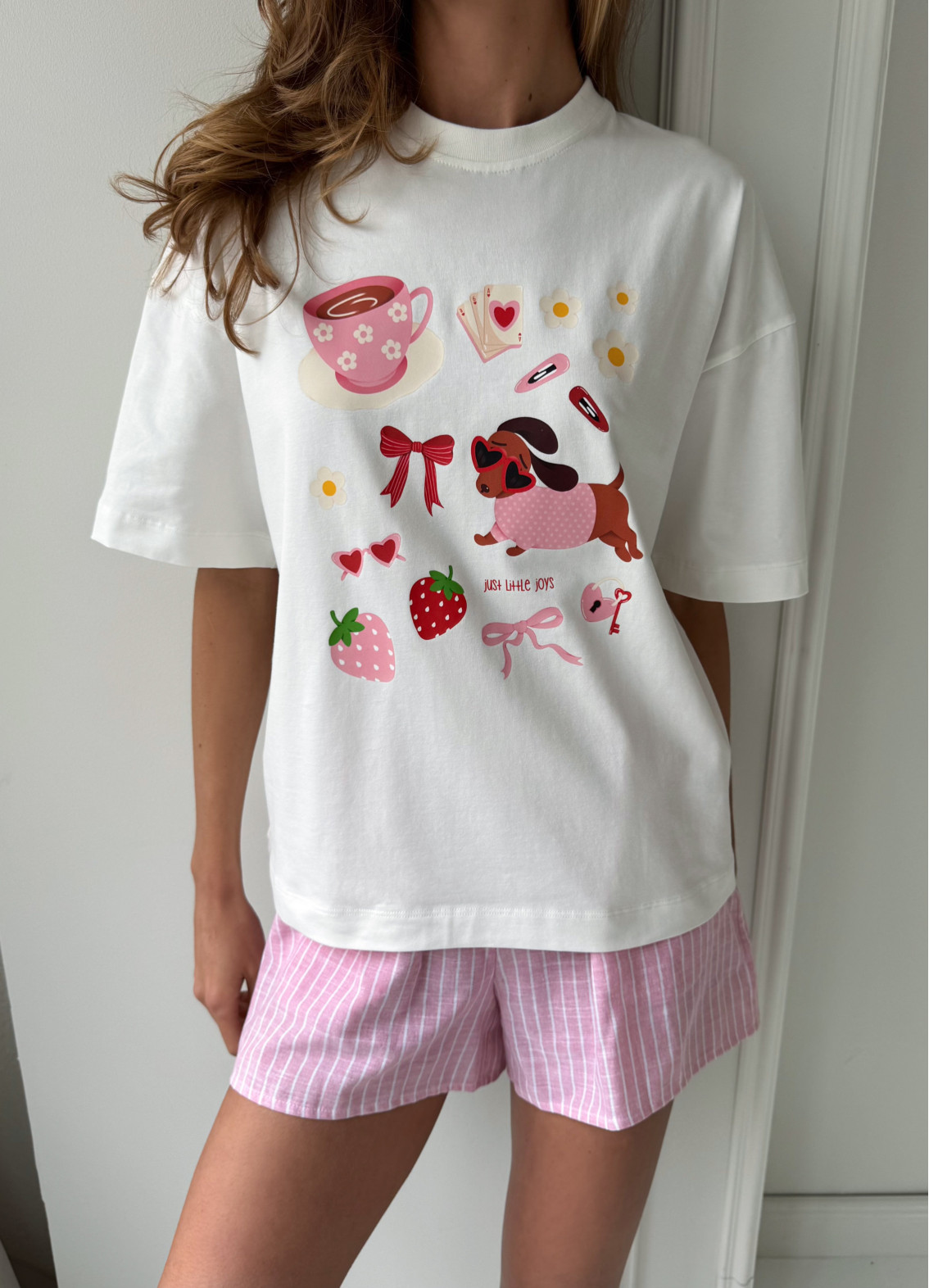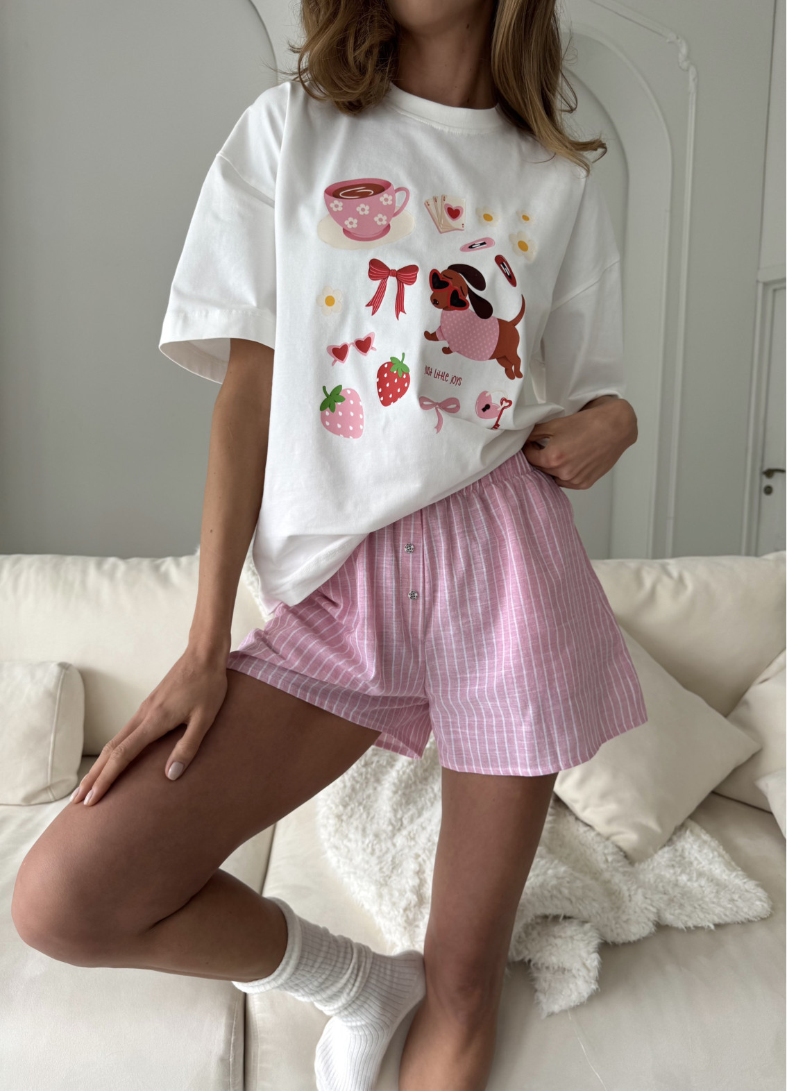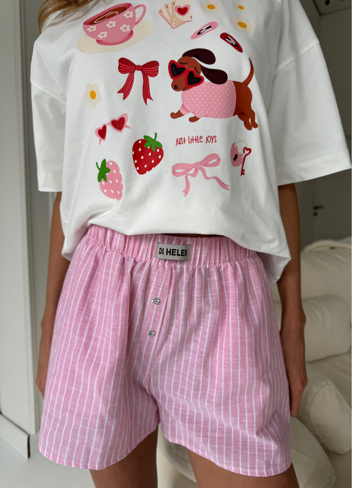 Піжама "Little joys" — комфортний та стильний комплект для затишного домашнього відпочинку. М’яка та приємна до тіла тканина забезпечує легкість рухів і зручність упродовж усього дня. Модель поєднує універсальну футболку з кольоровим принтом та шорти, створюючи практичний та сучасний домашній образ.