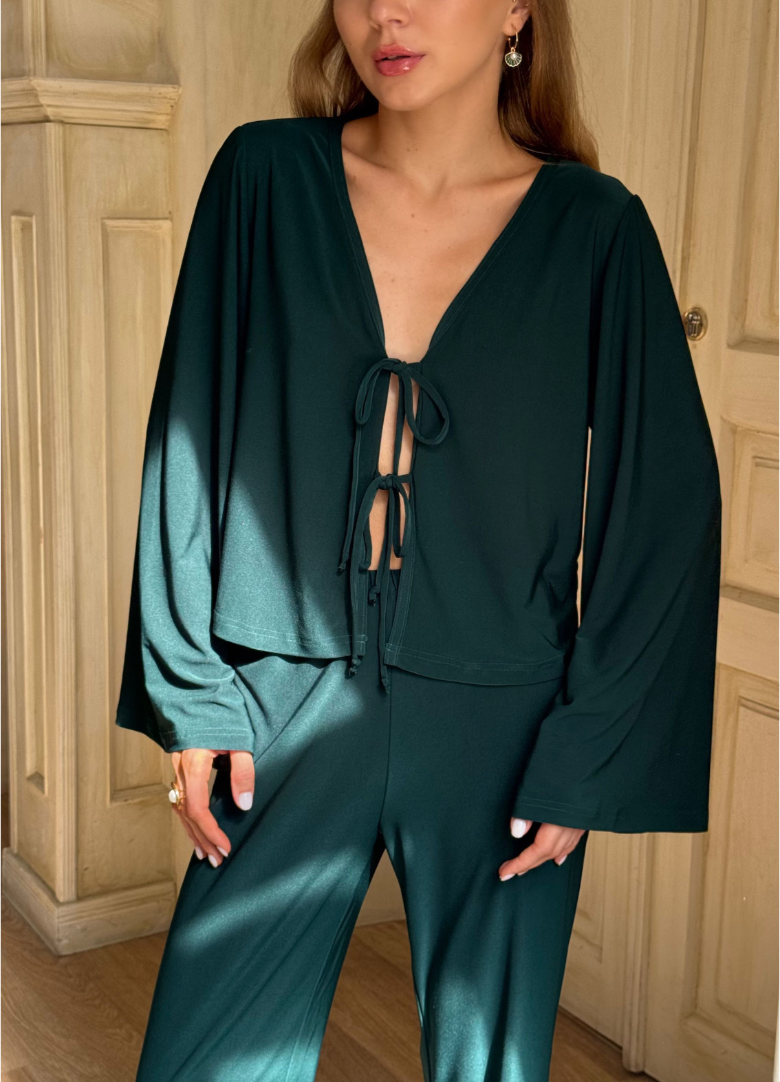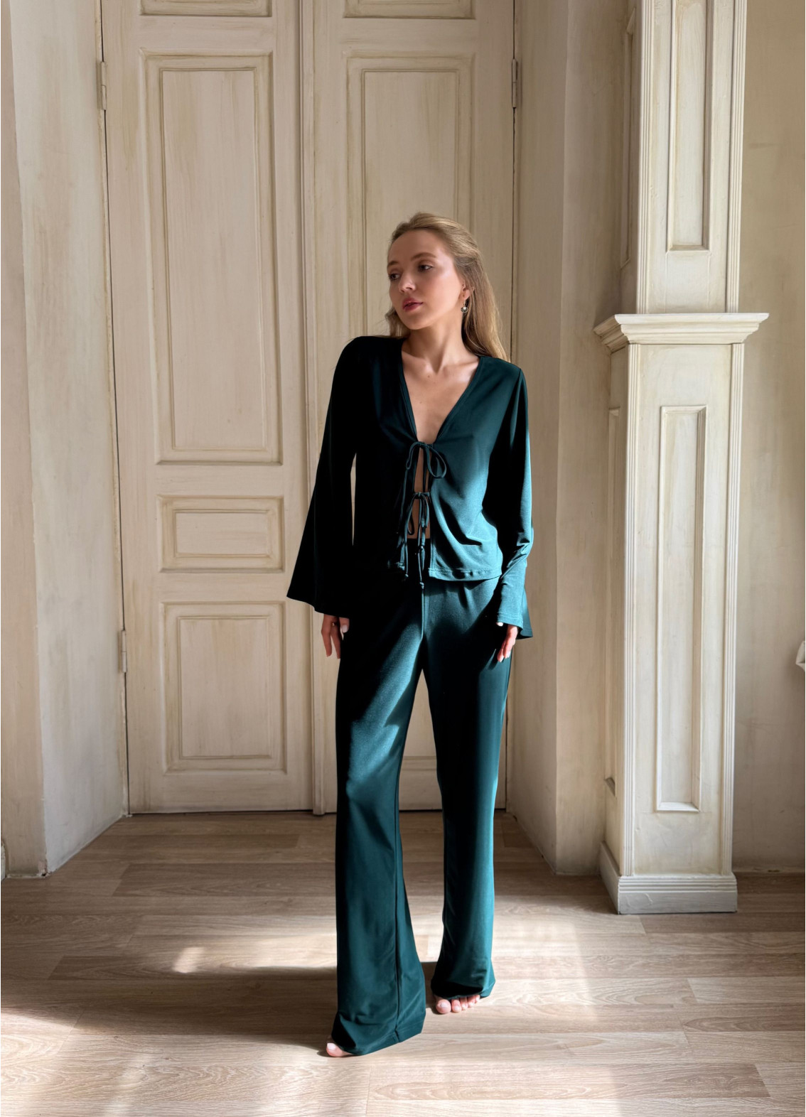 - Верх: з довгими рукавами та глибоким V-подібним вирізом, доповнений зав'язками.
