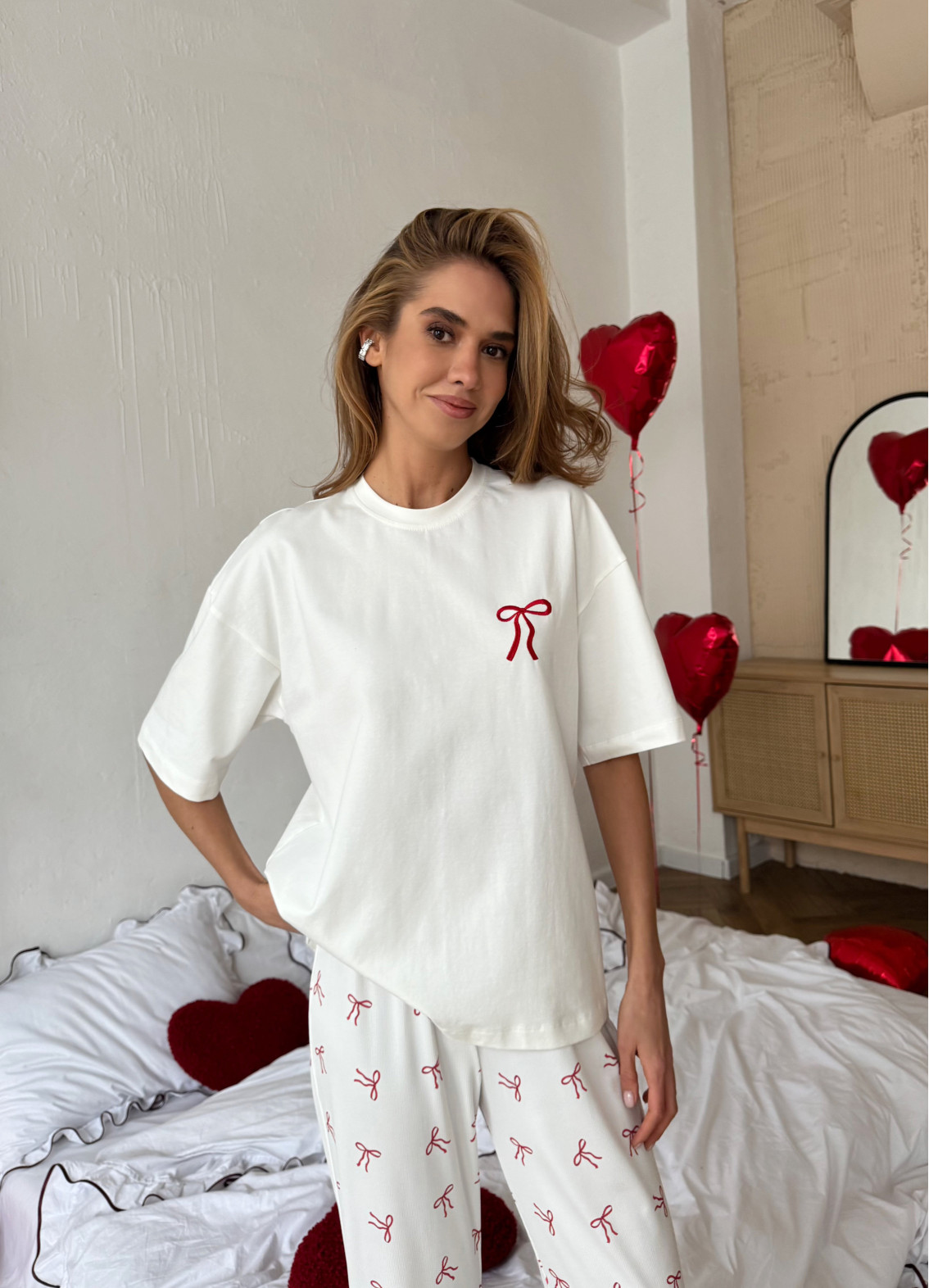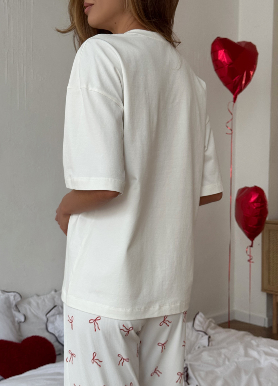 Піжама «Нонна» — це поєднання ніжності, комфорту та грайливого стилю для вашого домашнього відпочинку. М'яка біла футболка з маленьким червоним бантиком додає легкості та романтичного настрою, а штани з текстурою «рубчик», прикрашені червоними бантиками по всій довжині, створюють чарівний та неповторний образ. Цей комплект ідеально підходить для затишних вечорів, релаксу вдома та спокійного сну.
