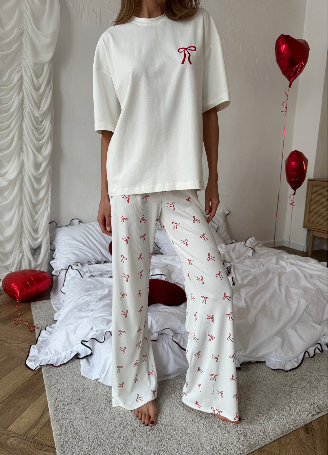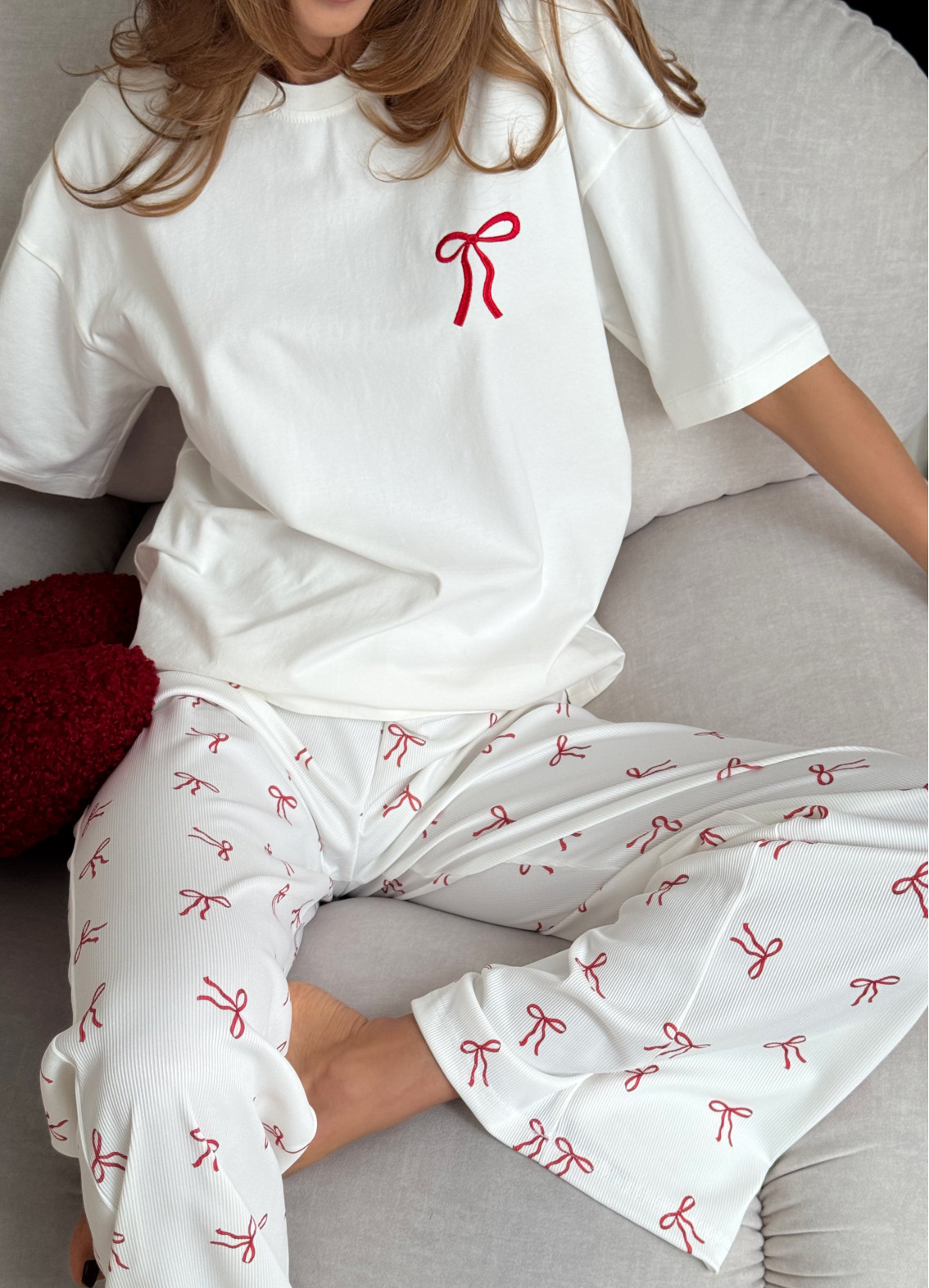 - Штани з текстурою «рубчик», прикрашені червоними бантиками по всій довжині, додають образу грайливості та шарму.