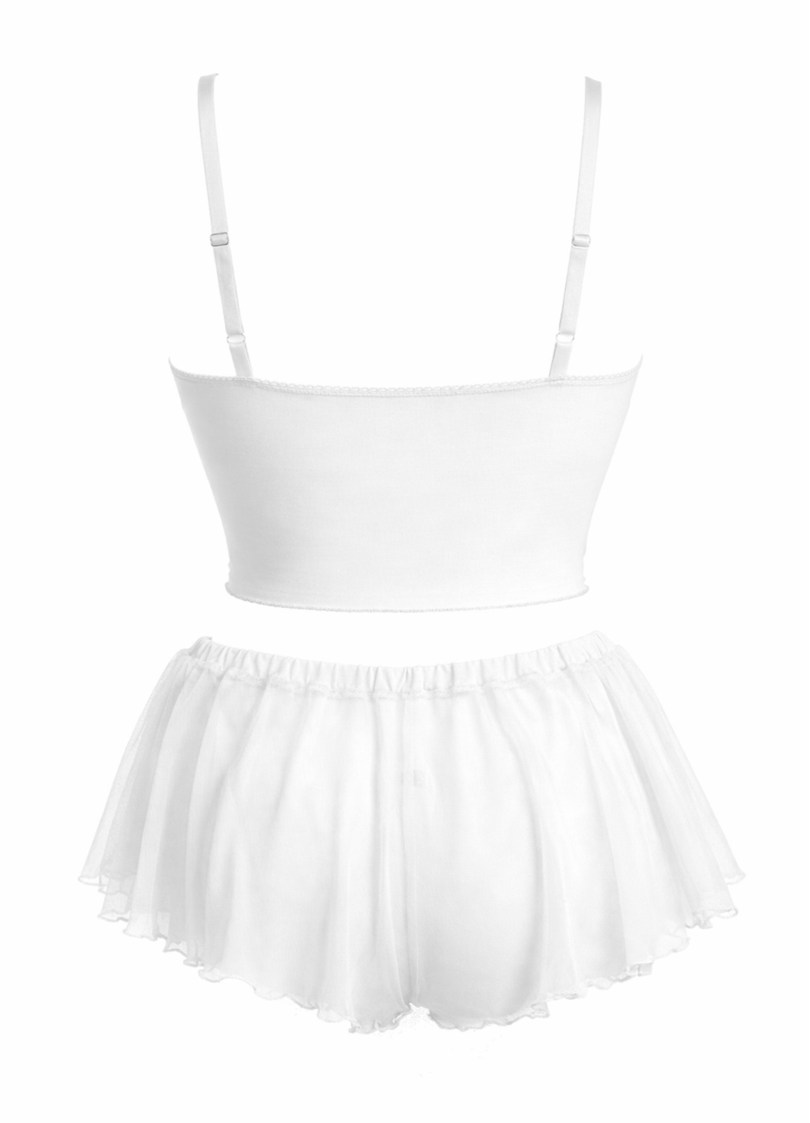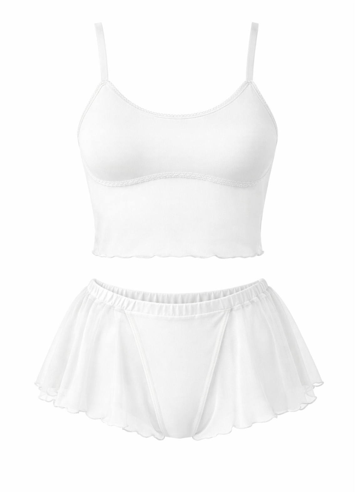 - Низ: міні-шорти з легкої напівпрозорої сітки, оздоблені м’яким хвилястим краєм.