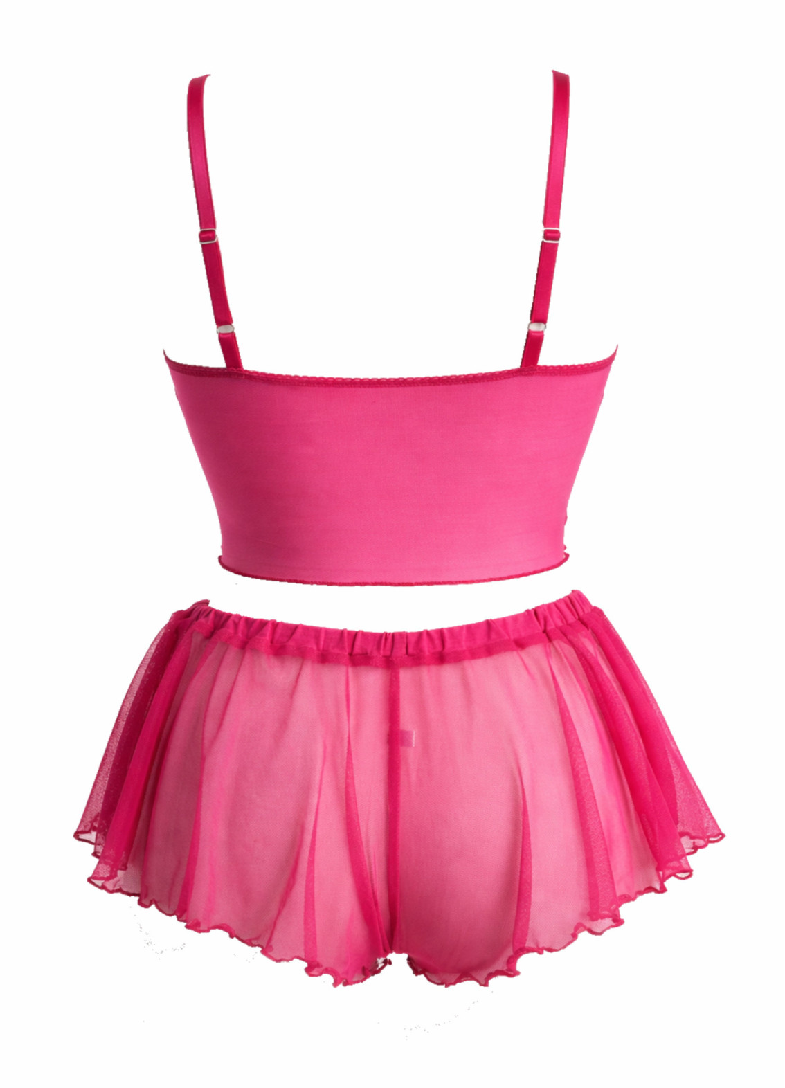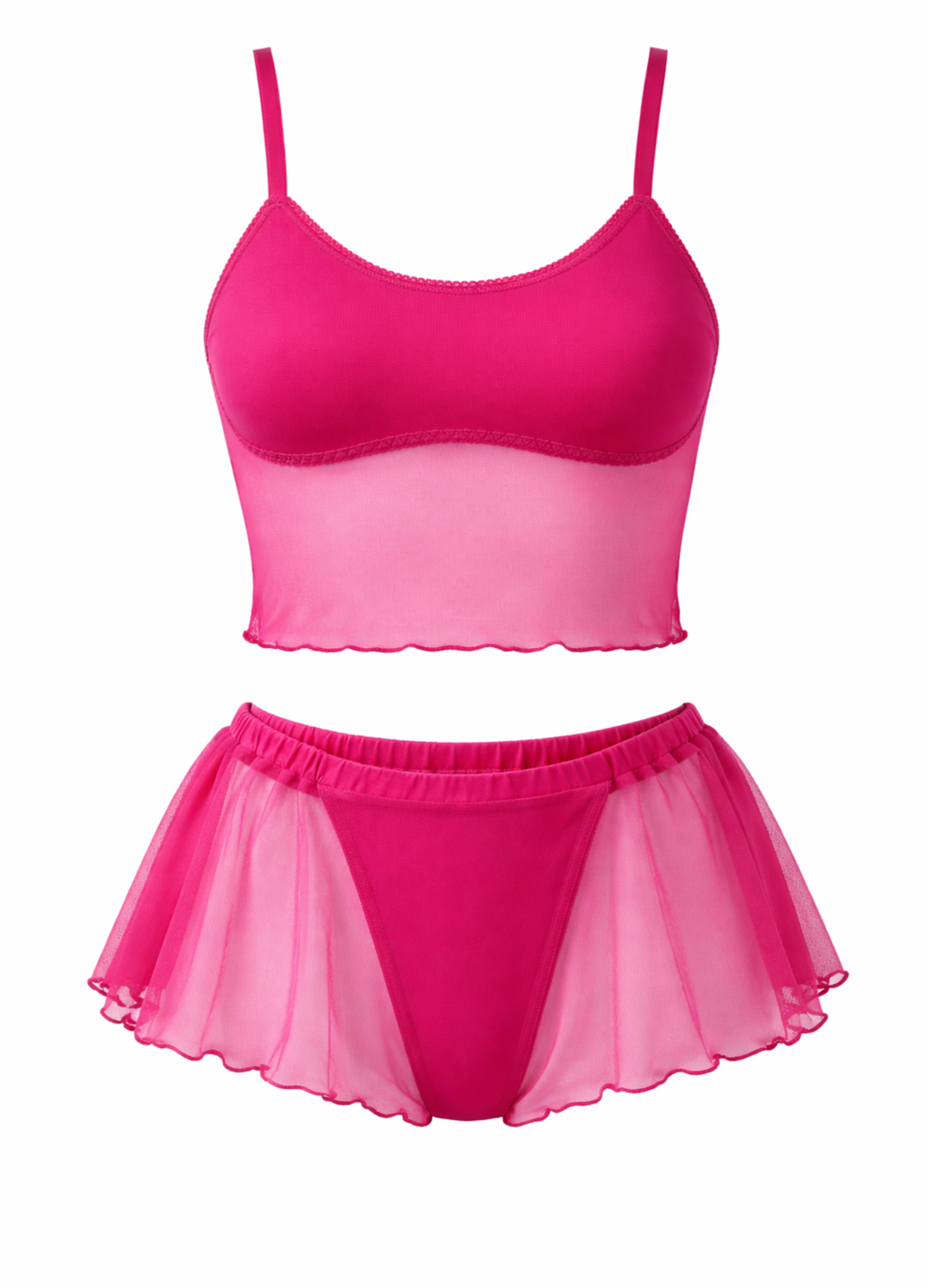 - Низ: міні-шорти з легкої напівпрозорої сітки, оздоблені м’яким хвилястим краєм.
