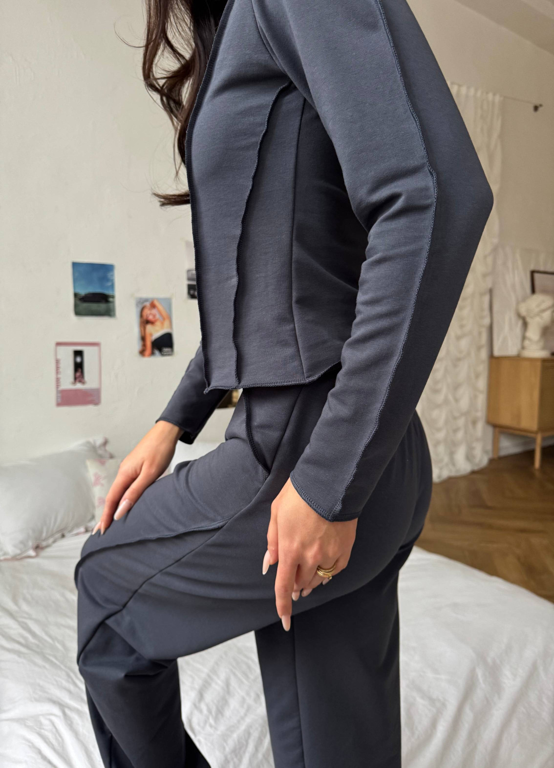 Костюм складається з лонгсліва з довгими рукавами та вільних штанів із високою посадкою. Верх має оригінальні декоративні шви, які додають модного акценту та візуально витягують силует. Штани на м’якій резинці забезпечують комфортну посадку на талії, а прямий крій створює ефект легкої недбалості та свободи.
