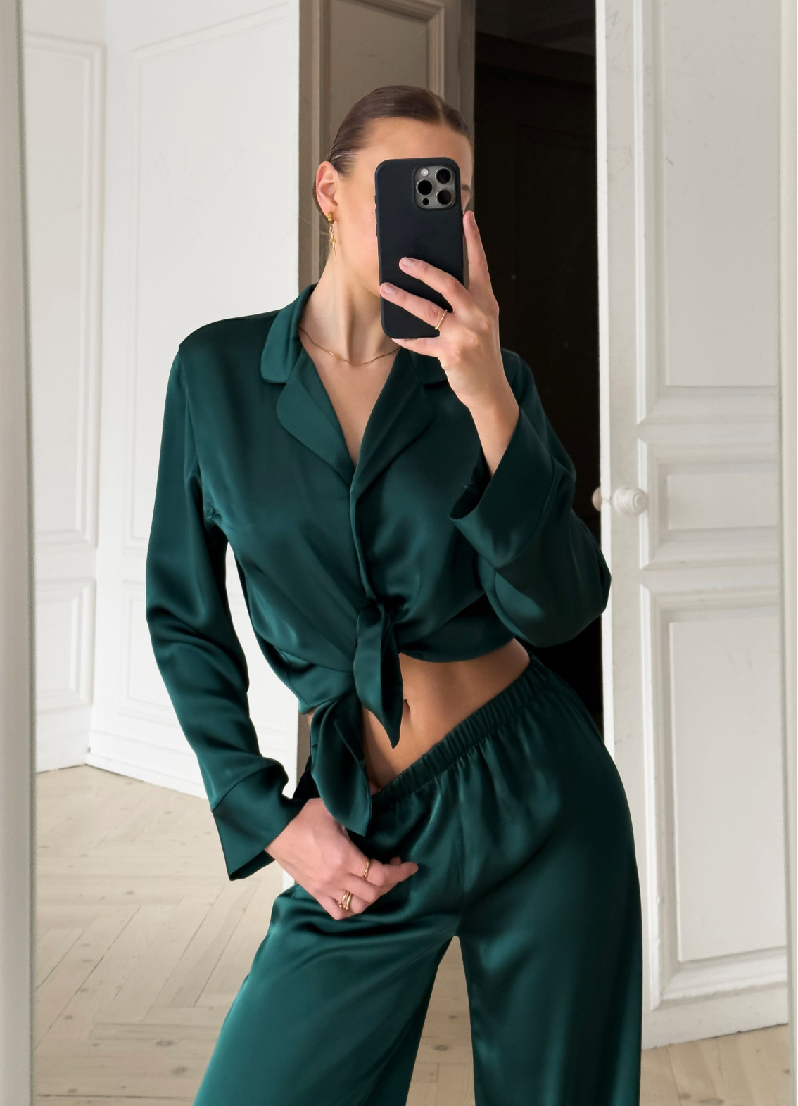 - Верх: сорочка з довгими рукавами та відкладним коміром, що додає класичного стилю.